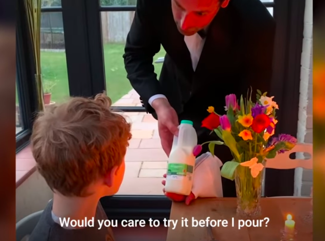 한 가정집에서 찍은 귀여운 영상이 화제가 되고 있습니다. 한 아버지가 아들,딸에게 웨이터로 빙의해 식사를 대접하는 모습을 귀엽게 연출했습니다. 와인잔에는 우유를 따르고, 아이는 와인처럼 우유를 빙빙 돌려서 시음하는 모습입니다.