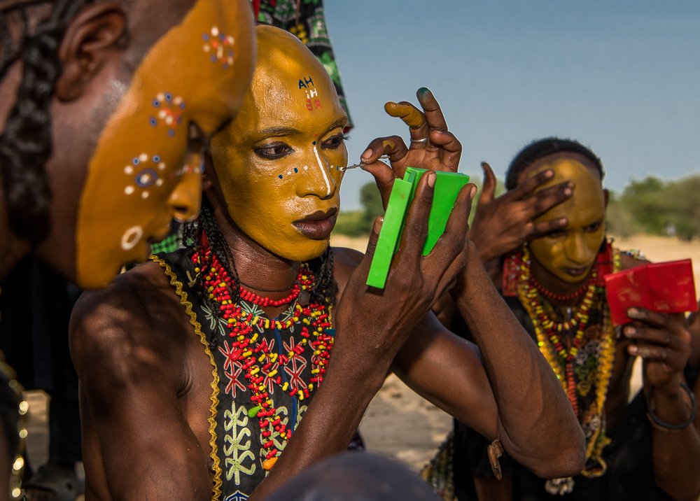 이성에게 어필하기 위해서 화장하고 꾸미는 행동은 보통 여자들이 많이 하는 것이지만, 우타베족은 반대입니다. 매년 우타베족들은 게레울 축제를 행하는데요. 이 축제에는 화려하고 키가 큰 남자들이 참여하게 됩니다. 예쁘고 화려하고 치장을 하고 일렬로 서서 여성들 앞에서 유혹하기 위해 노력합니다.